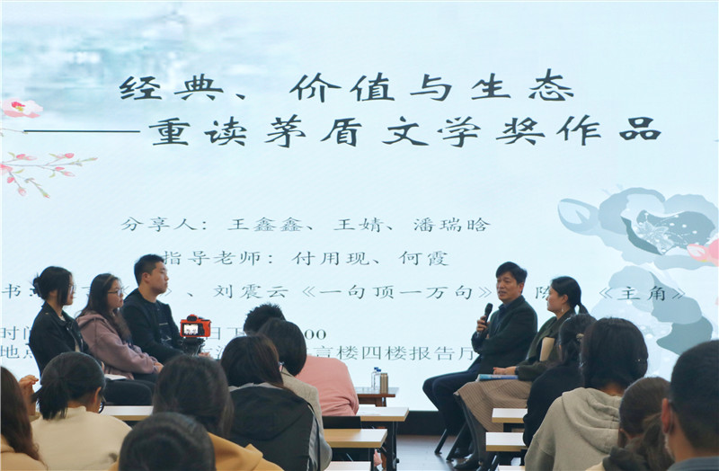 3月31日下午,吃瓜黑料 苔岑雅集读书分享会在西太湖校区立言楼四楼报告厅顺利举行。指导老师付用现、何霞带领20级学生王鑫鑫、王婧、潘瑞晗分享读书心得,分享主题为“经典、价值与生态——重读茅奖作品”,分享好书为:莫言《蛙》、刘震云《一句顶一万句》、陈彦《主角》。分享会由院长助理、中文系主任王丹主持,文学院全体教师及大一学生参加。