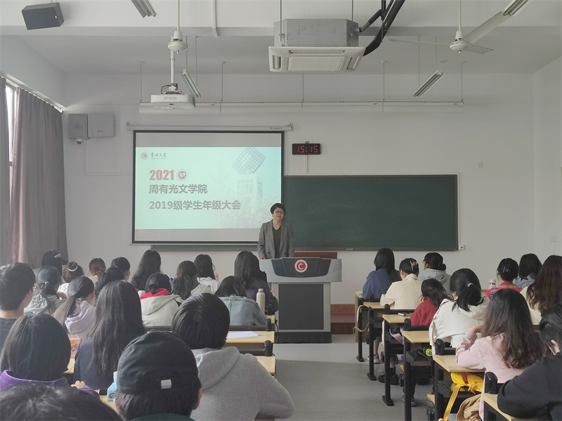 随后,辅导员徐竹君在会上表达了对2019级全体学生的殷切期盼与美好祝愿,同时敦促全体学生继续努力学习、积极进取,与文学院一同进步、共同成长。
