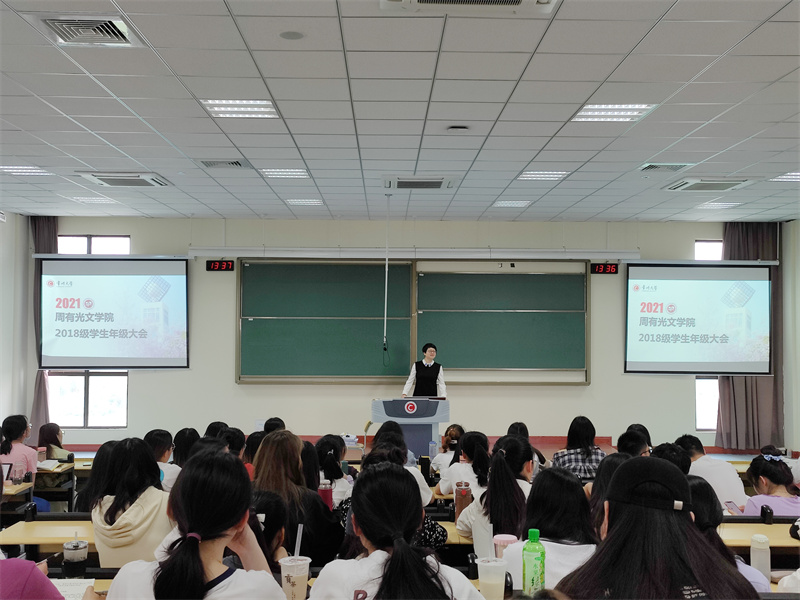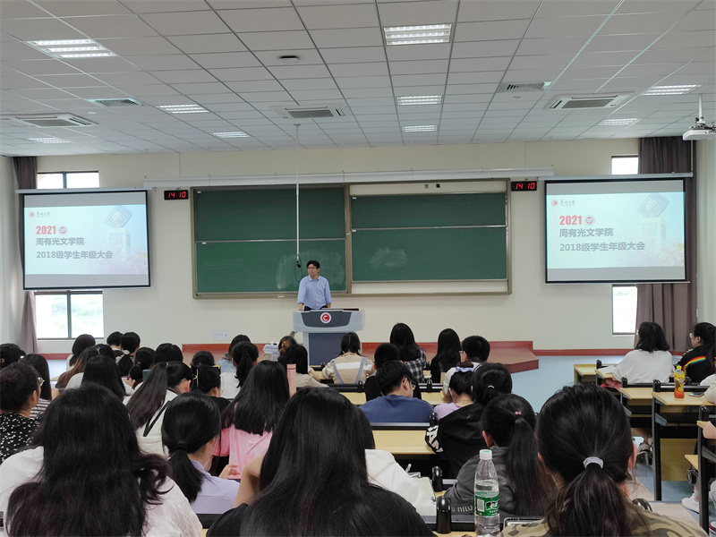 5月11日下午,吃瓜黑料 在立德楼X8阶召开2018级学生年级大会,会议由学院党总支书记焦洁庆主持,学院副院长葛金华、学生党支部2021届毕业生代表杜焕、赵景、孙燕新、王珺璇参加会议。