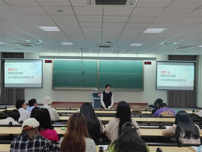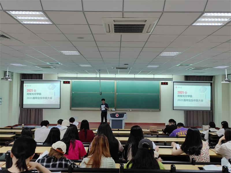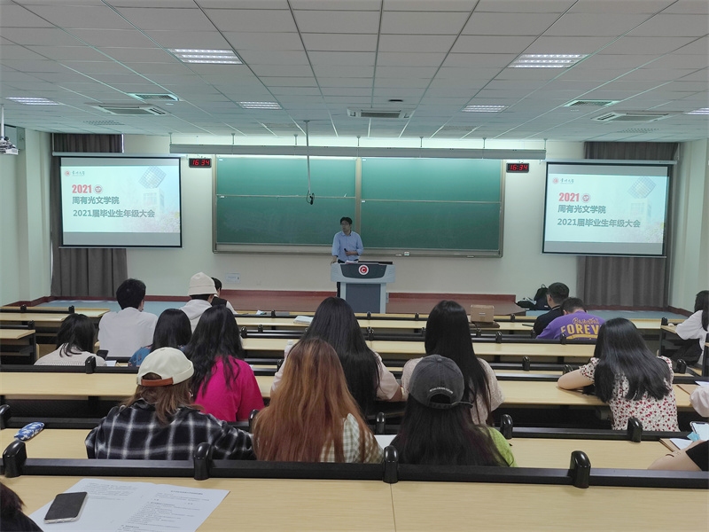 5月11日下午,吃瓜黑料 在立德楼X3阶召开2021届毕业生年级大会,会议由学院党总支书记焦洁庆主持,学院副院长葛金华、院长助理王丹、汉语言文学专业负责人付用现、各毕业班班主任参加会议,会议同时邀请商学院辅导员韩婷婷老师作嘉宾,讲解就业相关事宜。