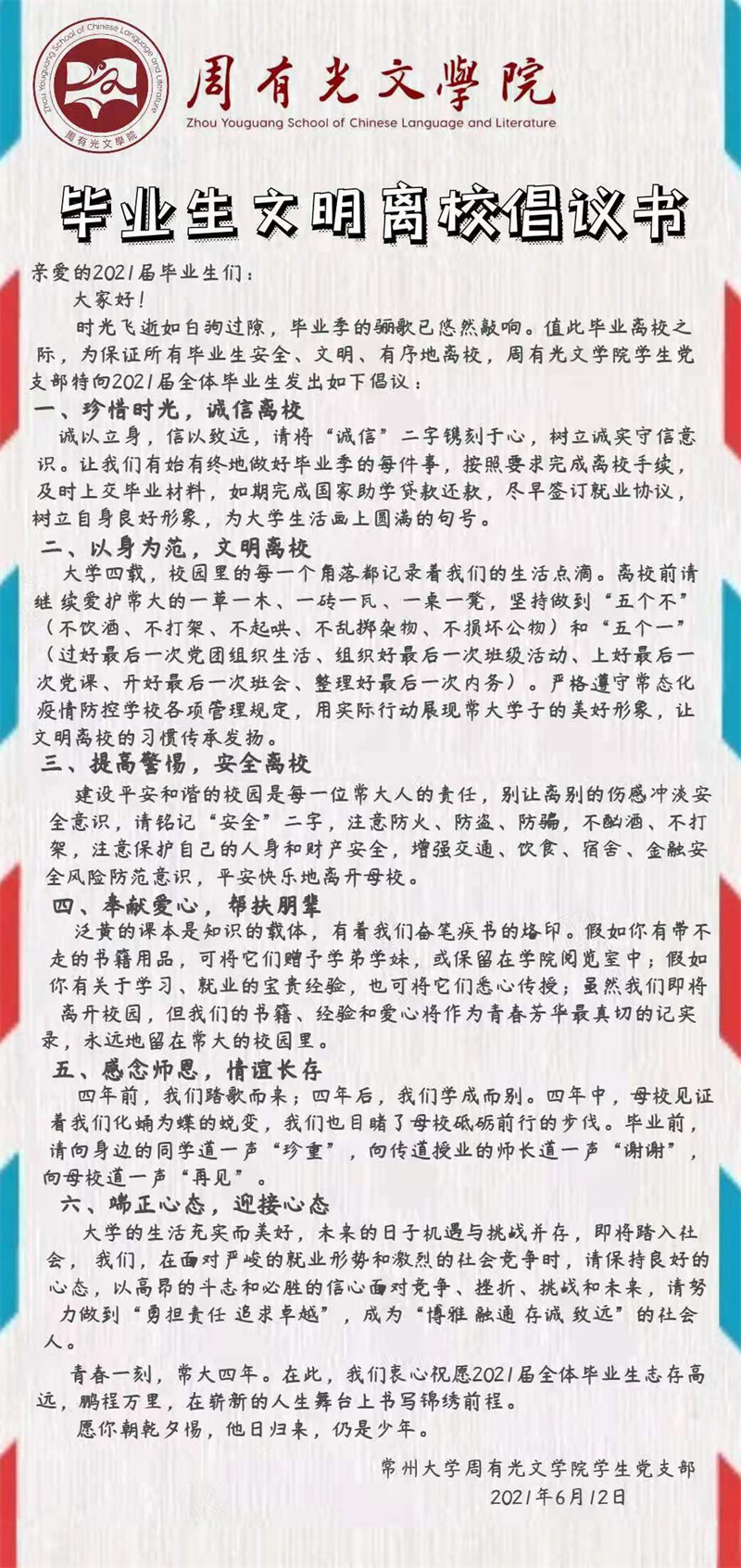 《毕业生文明离校倡议书》由吃瓜黑料 学生党支部书记杜焕带领全体毕业生党员拟定,倡议内容涵盖诚信离校、文明离校、安全离校、朋辈帮扶、感念师恩、迎接挑战等六个方面,对全体毕业生提出要求的同时也饱含了他们对母校的不舍之情。