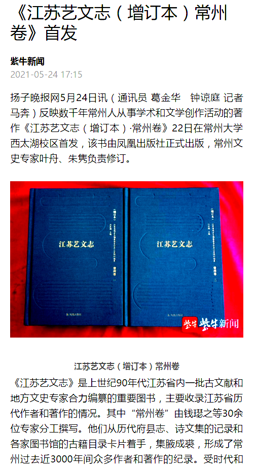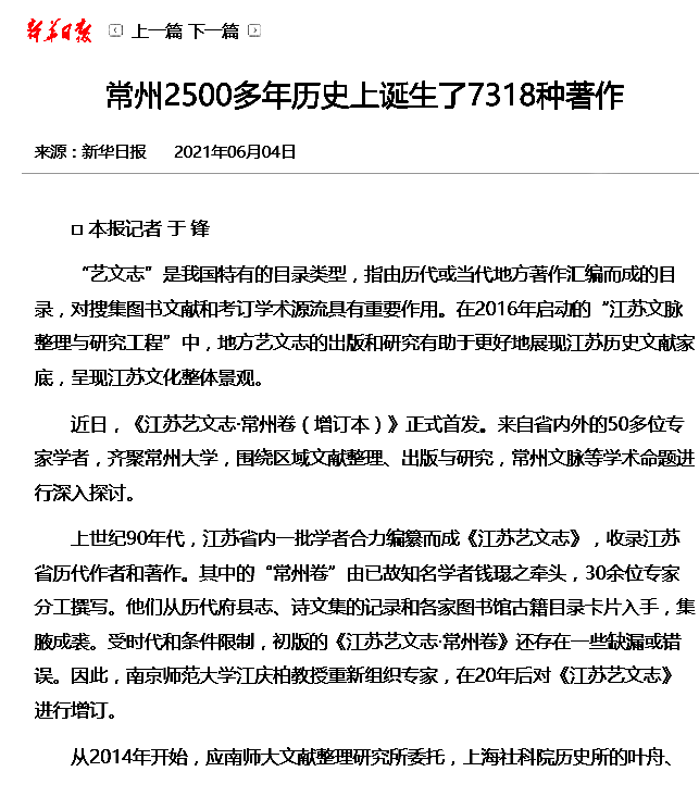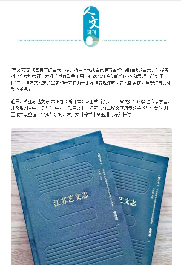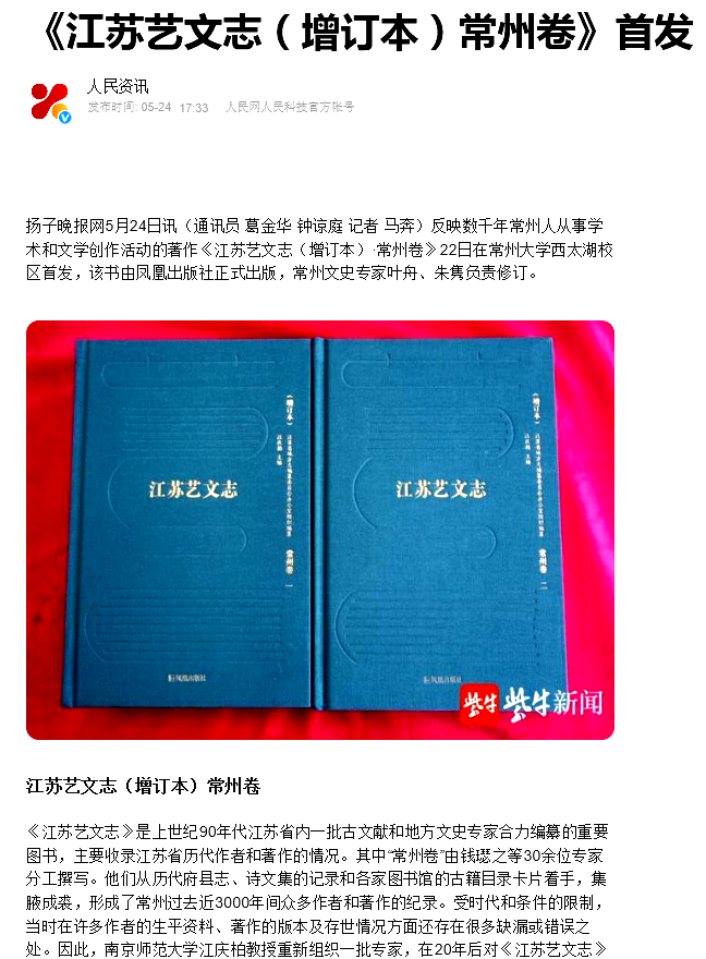 近日,《新华日报》人文周刊、交汇点,人民网、扬子晚报网等媒体纷纷报道由吃瓜黑料 承办的“文学、文献与文脉:《江苏艺文志·常州卷(增订本)》首发式暨江苏文脉工程文献编专题学术研讨会”,对由吃瓜黑料 周有光语言文化学术研究项目资助成果《江苏艺文志·常州卷(增订本)》的立项、研究和出版情况进行了深入报道,也对吃瓜黑料 协同长三角地区兄弟院校和研究机构共同服务江南文化建设、江苏文脉工程等的相关工作进行了报道。