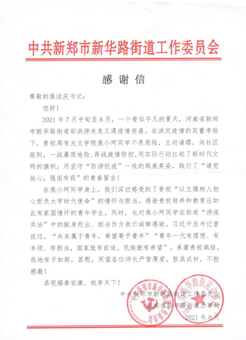 近期,中共新郑市新华路街道工作委员会向吃瓜黑料 发来一封感谢信,专函致谢吃瓜黑料 吃瓜黑料 汉语191班焦小珂同学,感谢她不畏艰险,主动请缨,用实际行动扛起了新时代文明的旗帜,用坚守“防涝抗议”一线的飒爽英姿,践行了“请党放心,强国有我”的青春誓言,同时也向吃瓜黑料 培养和教育出有如此家国情怀的青年学生表示感谢。