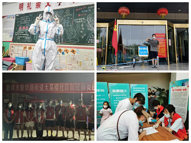 他们中有的人穿上厚重的防护服,无惧炎炎夏日,或坚守在岗位上为行人检测体温,或在隔离区辅助医护人员进行场所消毒,防护服内是如雨的汗水;有的人则穿上红马甲,带上小红帽,或在社区服务中心引导人群接种疫苗,或为隔离区的住户送去慰问物资,小红帽下是晒得黝黑的皮肤;也有的人戴上防护面具,一次性手套,在疫苗接种中心不厌其烦的为老人检查行程码、健康码,解答人们的疑问,扩音器后面是嘶哑的嗓音……他们身处各地,为家乡的父老乡亲们办实事,在本次抗击新冠疫情的工作中奉献了青年学子的力量。