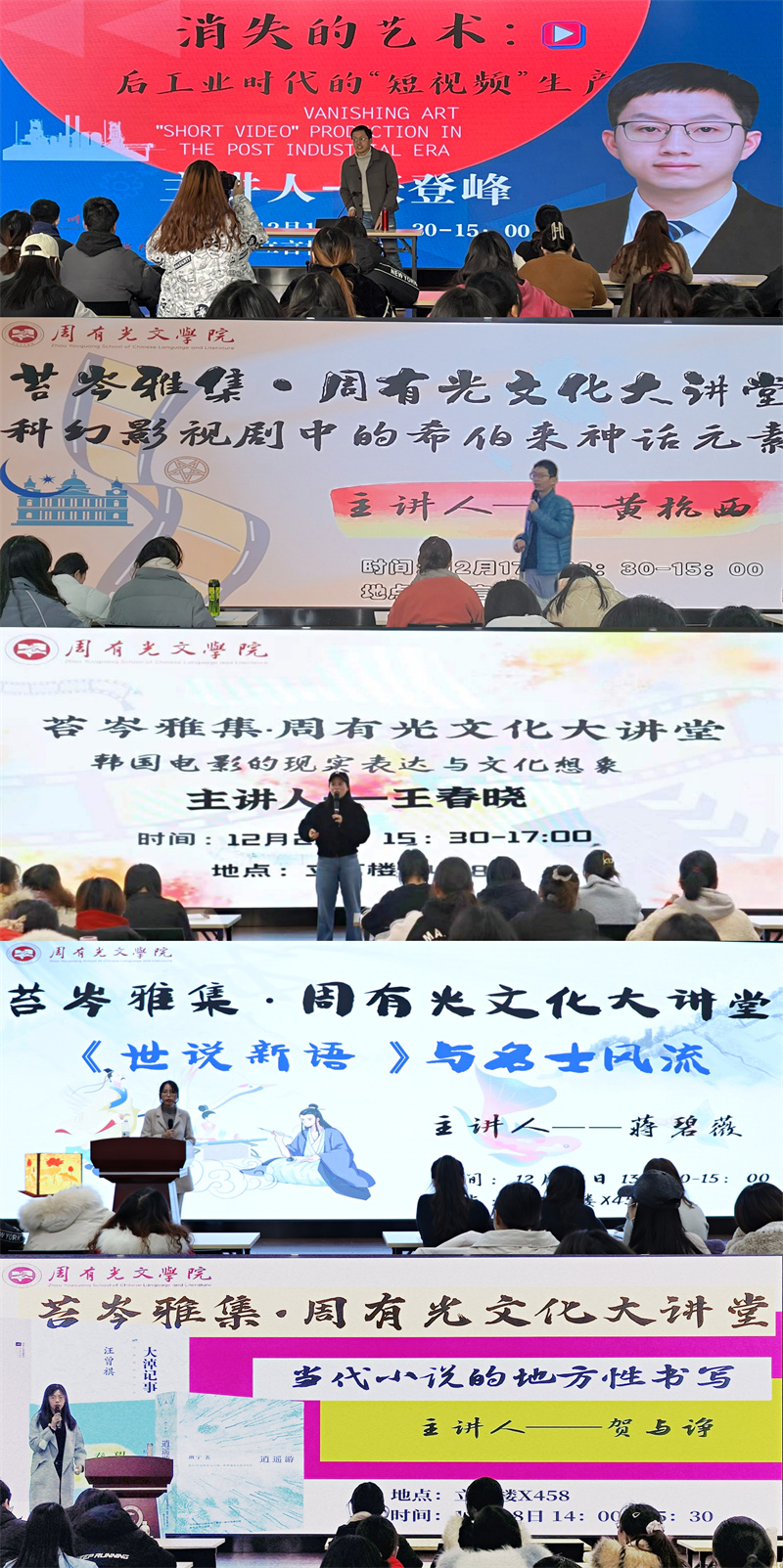 12月10日-28日,我院“苔岑雅集·周有光文化大讲堂”再次上线,学院张登峰、黄杭西、王春晓、蒋碧薇、贺与诤等5位博士分别以“消失的艺术:后工业时代的短视频生产”、“科幻影视剧中的希伯来神话元素”、“韩国电影的现实表达与文化想象”、“《世说新语》与名士风流”、“当代小说的地方性书写”等为题做了5场高质量讲座。学院党总支书记焦洁庆、副院长葛金华、院长助理王丹、各系部主任等到会并参与交流,学院各年级同学先后300多人参与讲座和互动。