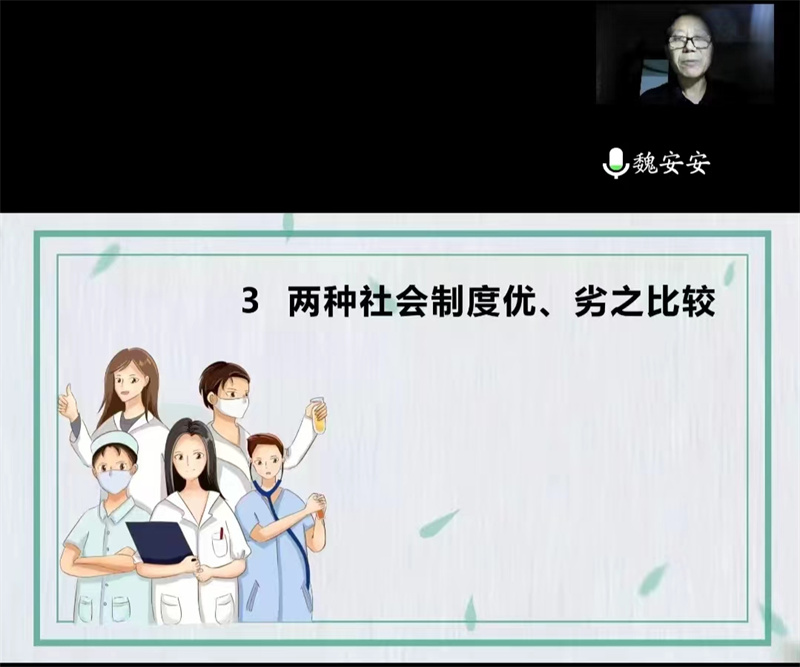 魏安安教授以“从中美抗疫效果看两种社会制度的优劣”为主题,从“抗疫”策略与效果比较阐述了中国特色社会主义制度的优势。通过国内外抗疫数据对比,说明我国在此次大考中做足准备、充分应对、主动出击,对病毒采取疏堵结合的方式,为全球交出了一份令人满意的答卷。他指出,疫情发生以来,在以习近平同志为核心的党中央领导下,坚持全国一盘棋,发挥***制优势,举全国之力全力应对,形成抗击疫情的强大合力。经过全国上下艰苦努力,我国疫情防控工作取得了卓越成效,并为世界抗疫工作提供了宝贵经验,彰显了中国共产党的领导和中国特色社会主义制度的显著优势。他强调,此次疫情大考仍未结束,作为大学生,应该带头遵守国家及学校的各项疫情防控规定,服从疫情防控统一管理,为疫情防控工作作出力所能及的贡献,寄语毕业生铭记责任校训,发扬勇担责任,追求卓越的学校精神,在人生新的赛道上跑出自己最好的成绩。