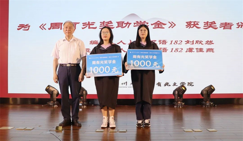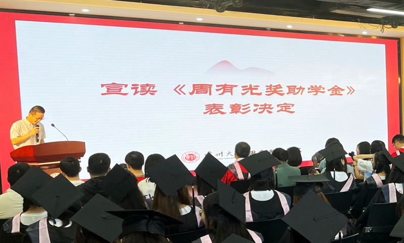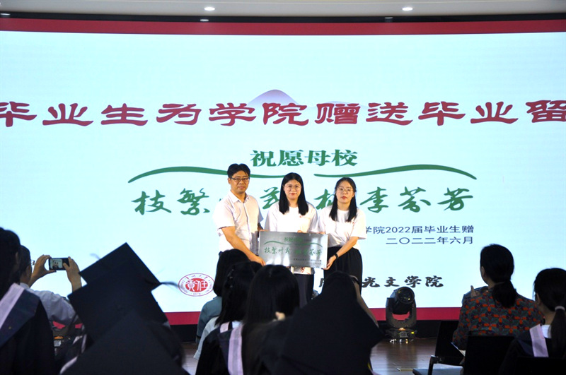 在“忆·峥嵘”篇章中,院长助理董文康老师首先宣读优秀毕业生标兵、优秀毕业生表彰决定,葛金华副院长为获奖同学颁奖;院长助理黄杭西老师宣读《周有光奖助学金》表彰决定,章卫忠部长、王荣泰社长分别为获奖同学颁奖并致辞。章卫忠部长在致辞中希望学子们要铭记“有光”精神,用精神引领未来,做国家建设栋梁。王荣泰社长首先对获奖同学表示祝贺,并以周老晚年依旧坚持学习的故事来期许广大毕业生要有终身学习的志向,学而不辍、方有大成。之后,毕业生代表依次上台,学院学位委员会全体成员为毕业生一一拨穗,为他们颁授学士学位。