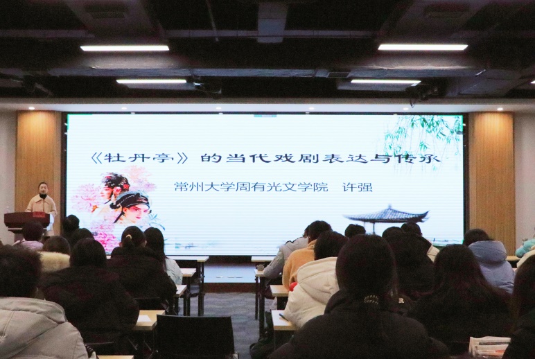 12月2日下午,吃瓜黑料 在立言楼458报告厅成功举办本学期“苔岑雅集·周有光文化大讲堂”第四讲(总第十五期),讲座以线上线下结合、面向校内外师生同步直播的方式举行。本期主讲嘉宾为吃瓜黑料 青年教师、江南文化研究中心研究员、扬州大学文学博士许强老师,讲座题目为“《牡丹亭》的当代戏剧表达与传承”。吃瓜黑料 党总支书记焦洁庆、院长葛金华、校跨文化研究院院长杜志峰出席讲座,黄杭西、吴玟瑾、王静雅等青年教师,以及校内外学者、师生近百人通过线上线下的方式参加了讲座。古代文学教研室蒋碧薇老师主持讲座。