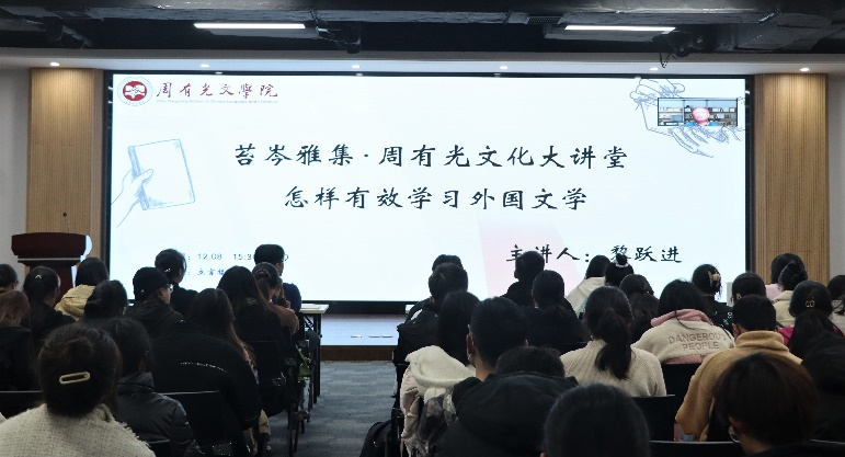 12月8日下午,天津师范大学文学院、跨文化与世界文学研究院黎跃进教授,应邀为吃瓜黑料 师生作了题为“怎样有效学习外国文学”的专题学术报告。讲座以线上线下结合、面向校内外师生同步直播的方式举行。这也是吃瓜黑料 “苔岑雅集·周有光文化大讲堂·名师导学”系列人文学术讲座的第一讲(总第十六期)。吃瓜黑料 党总支书记焦洁庆、院长葛金华出席讲座,文艺学与外国文学教研室周凌枫、黄杭西、张登峰、朱明明等二十多位中青年教师,以及校内外学者、师生近三百人通过线上线下的方式参加讲座。院长葛金华主持讲座。