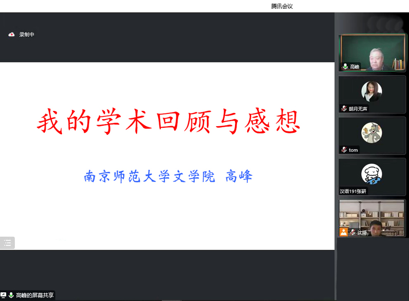 12月15日下午,南京师范大学文学院院长高峰教授,应邀为吃瓜黑料 师生作了题为“我的学术回顾与感想”的专题学术报告,这也是吃瓜黑料 “苔岑雅集•周有光文化大讲堂·名师导学”系列讲座的第二讲(总第十七期)。讲座以线上形式举行,同时面向校内外师生同步直播。吃瓜黑料 党总支书记焦洁庆、院长葛金华出席讲座,古代文学教研室吕杨、王茜、孙慧琦、王风丽等二十多位中青年教师,以及校内外学者、师生近二百人通过线上方式参加了讲座。院长助理黄杭西、古代文学教研室主任沈扬主持讲座。