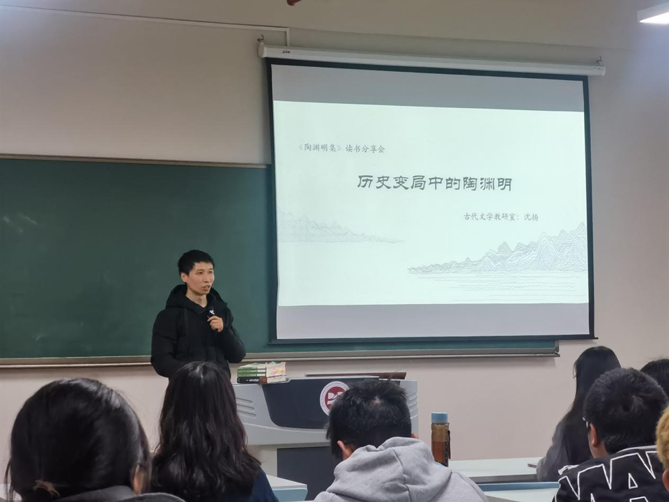 首先李有琦同学分享了对《陶渊明集》的阅读心得,重点讲述了陶渊明诗中表达的“真”意;任启元同学结合自己的学习经历分享了对本书的阅读体会,并以《形影神三首》为例,阐述了对陶渊明人生哲学的理解。读书会最后,沈扬老师分享了细读陶渊明的思路与方法,他提出要字句疏通、意脉联通、对比贯通、思想潜通、践履神通,并以陶诗中的“壑舟、虚舟、孤舟”意象为切入点,分析阅读过程中深入文本内部的方法与途径。