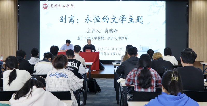 4月21日,浙江工业大学人文学院教授、浙江大学博导肖瑞峰先生应“苔岑雅集·周有光文化大讲堂”第二十三期邀请,在立言楼458为吃瓜黑料 师生作了题为“别离:永恒的文学主题”的学术讲座。院长葛金华、院长助理黄杭西、古代文学教研室沈扬、王静雅、许强等教师出席活动,校内外近两百位学者、师生共同参与。讲座由葛金华院长主持。