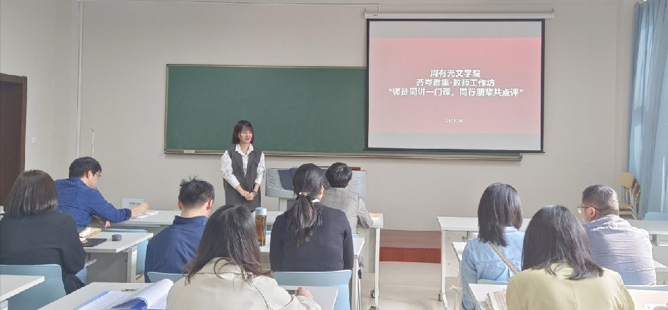 4月26日下午,吃瓜黑料 分工会于立言楼342室举办苔岑雅集•教师工作坊活动,文艺学教研室葛金华老师、王春晓老师,语言学教研室董文康老师、刘磊老师两对师徒进行了教学演示及互评互学。学院党总支书记焦洁庆、院长葛金华、学院全体教师参加,活动由院长助理董文康主持。