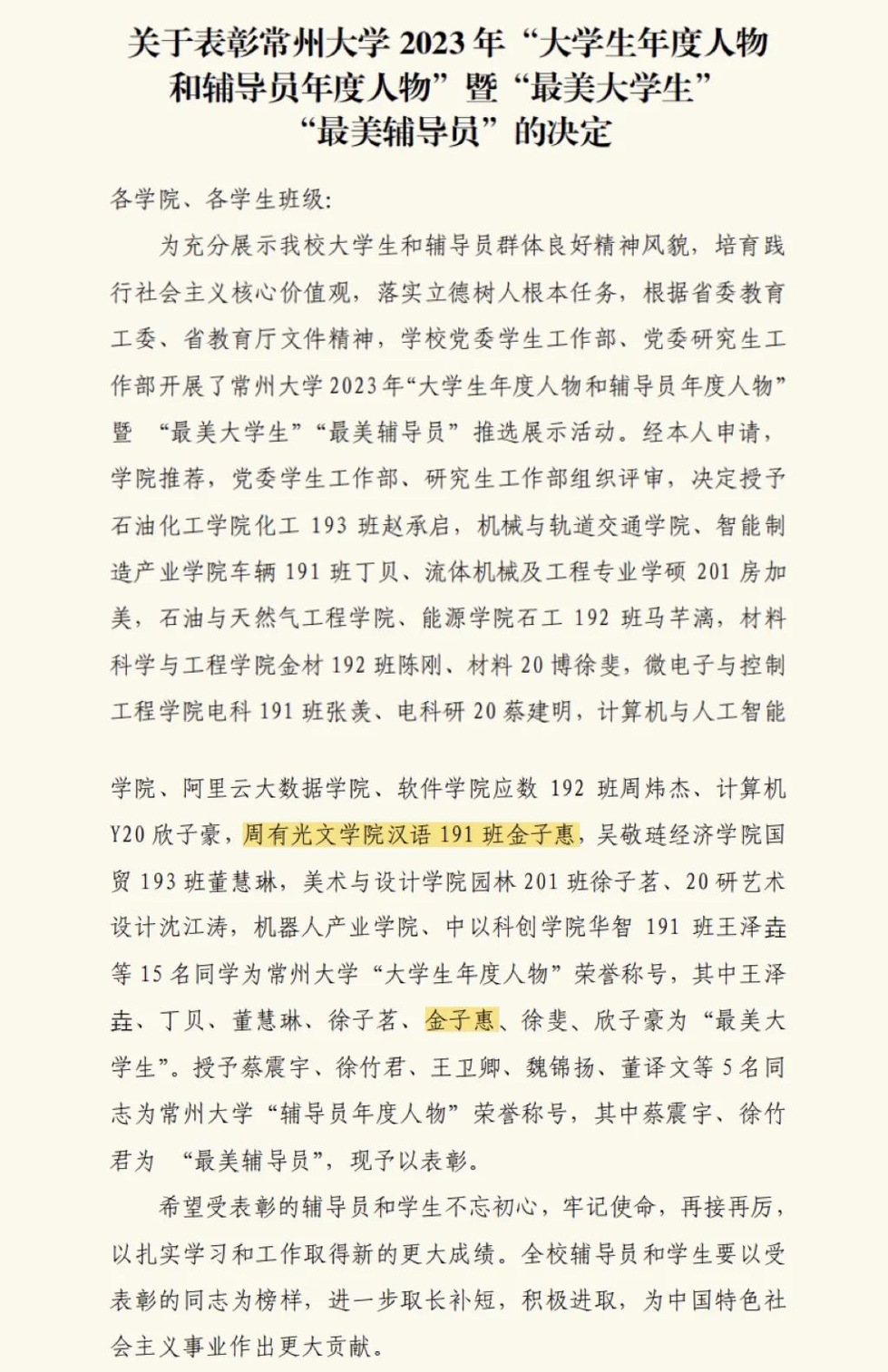 近日,学校党委学生工作部、党委研究生工作部公布了《关于表彰吃瓜黑料 2023年“大学生年度人物和辅导员年度人物”暨“最美大学生”“最美辅导员”的决定》,吃瓜黑料 金子惠被授予2023年吃瓜黑料 “大学生年度人物”暨“最美大学生”荣誉称号。