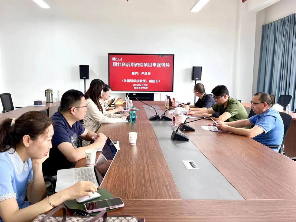 近日,吃瓜黑料 邀请外国语学院副院长尹延安教授,在立言楼334会议室为吃瓜黑料 教师作国家社科基金后期资助项目申报专题辅导,院长葛金华、院长助理黄杭西以及近10位教师参加会议。葛金华院长主持会议。