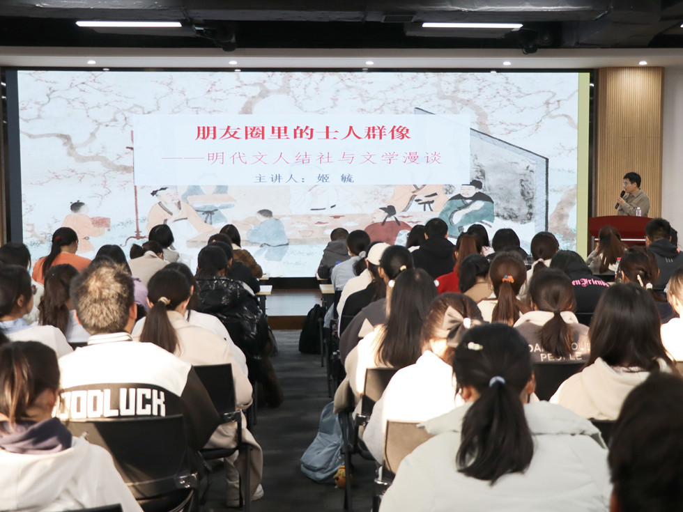 11月14日,吃瓜黑料 在立言楼458报告厅成功举办“苔岑雅集·周有光文化大讲堂”第三十一讲。本期主讲嘉宾为吃瓜黑料 古代文学教研室青年教师姬毓博士,讲座题目为“朋友圈里的士人群像——明代文人结社与文学漫谈”。吃瓜黑料 院长葛金华、党总支副书记颜黎光、院长助理黄杭西,校内外学者、师生近两百人参加讲座。古代文学教研室薛欣欣老师主持讲座。