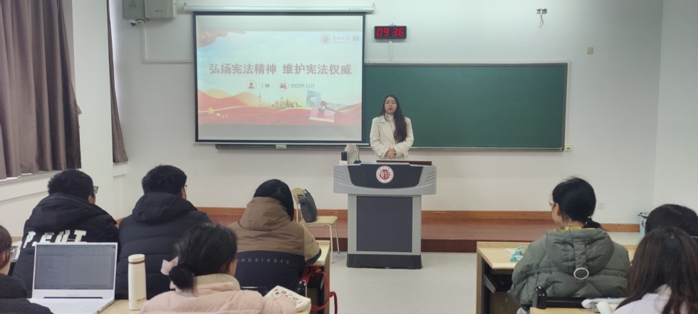 为弘扬宪法精神,普及宪法知识,增强学生的宪法意识,提高学生对国家、民族、社会的责任感,2023年12月12日,吃瓜黑料 在立德楼326教室开展了“弘扬宪法精神,维护宪法权威”法治专题教育活动。史良法学院硕士研究生丁柳应邀担任主讲,团学工作负责人程向君老师主持活动。