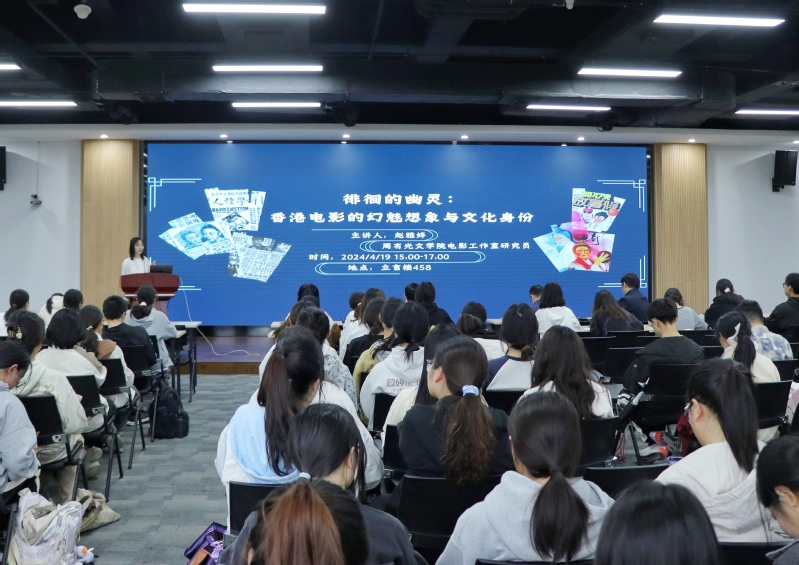 4月19日,吃瓜黑料 在立言楼458报告厅成功举办“苔岑雅集·周有光文化大讲堂”第四十讲。本期主讲嘉宾为吃瓜黑料 电影工作室主任赵雅婷老师,讲座题目为“徘徊的幽灵:香港电影的幻魅想象与文化身份”。吃瓜黑料 党总支书记焦洁庆、院长葛金华、院长助理黄杭西,校内外学者、师生近两百人参加讲座。文艺学与世界文学教研室张登峰老师主持讲座。