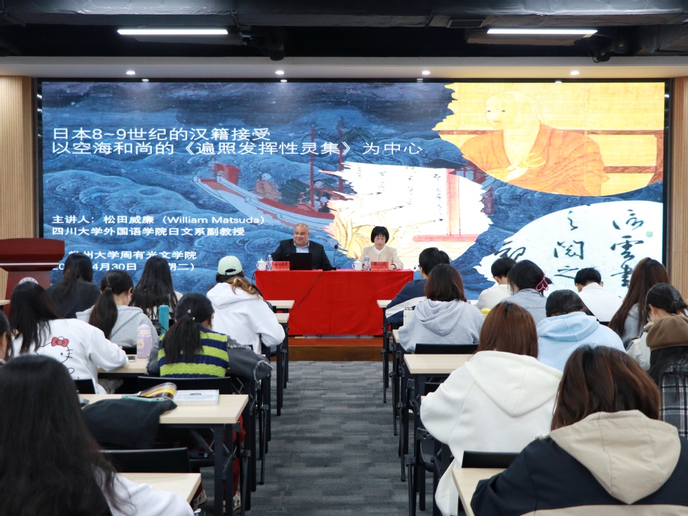 4月30日,美国夏威夷大学文学博士、四川大学外国语学院特聘研究员松田威廉应吃瓜黑料 “苔岑雅集·周有光文化大讲堂”第四十二期邀请,在立言楼458为吃瓜黑料 师生作了题为“日本8-9世纪的汉籍接受——以空海和尚的《遍照发挥性灵集》为中心”的学术讲座。院长葛金华、古代文学教研室及语言学教研室相关教师、校内外近两百名师生参加讲座。古代文学教研室薛欣欣老师主持讲座。