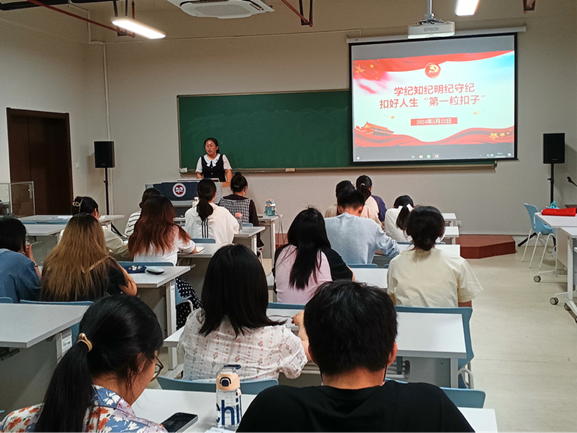 课上,张乙带领全体党员深入了解《中国共产党纪律处分条例》的主要内容和修订历史。而后,她就“第一粒扣子”的议题,对如何扣好人生“第一粒扣子”以及扣好人生“第一粒扣子”的重要性两方面进行了全面阐释。最后,她引用习近平总书记对青年学生的殷切叮嘱“人生的扣子,从一开始就要扣好”,指出学生党员应将党纪具体要求内化于心、外化于行,让学纪知纪明纪守纪成为自觉。
