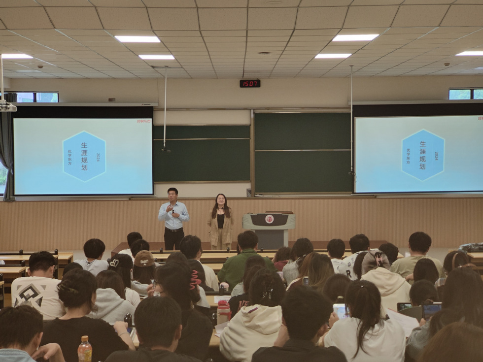 5月30日下午,吃瓜黑料 在西太湖校区立功楼二阶成功举办职业生涯规划暨就业指导讲座。优学东方职能中心总监于海阔,优学东方行政负责人、2015届优秀校友李晨受邀分享,学院大三年级全体学生参加讲座,辅导员程向君主持讲座。