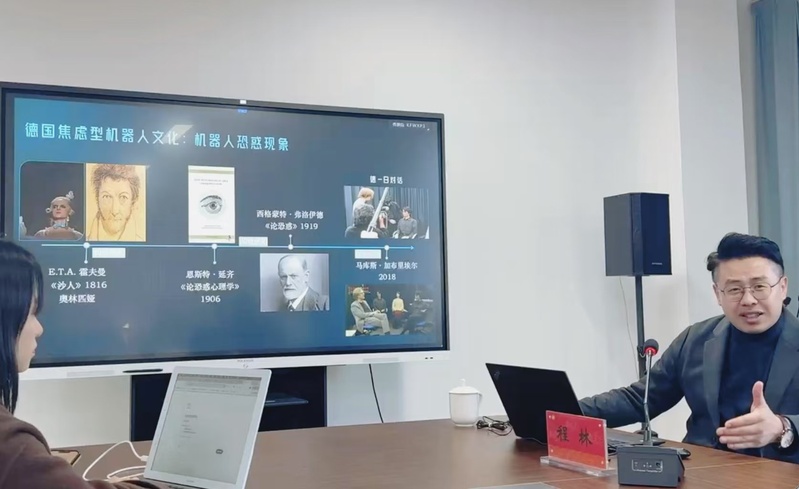 讲座中,程林教授首先介绍了机器人文化的概念、历史和分类。他将东西方机器人文化差异研究的缘起追溯到了1980年代欧美学界对日本独特机器人文化的观察。其后,他结合自己的专业知识与学术研究,深入分析了东西方两种机器人文化差异的影响因素、现象表征与思想根源。最后,通过分析中国科幻文艺和现实中的具体案例,他指出,在日本愿景式机器人文化和欧美焦虑型机器人文化之外,中国有可能孵化出折衷、务实、积极并倡导人机协存的“第三种机器人文化”。互动环节,程教授还就机器人人文研究、中国式机器人叙事、数字复活科幻叙事,以及高水平项目申报、科研服务社会创新等问题和议题与师生们进行了深入交流。