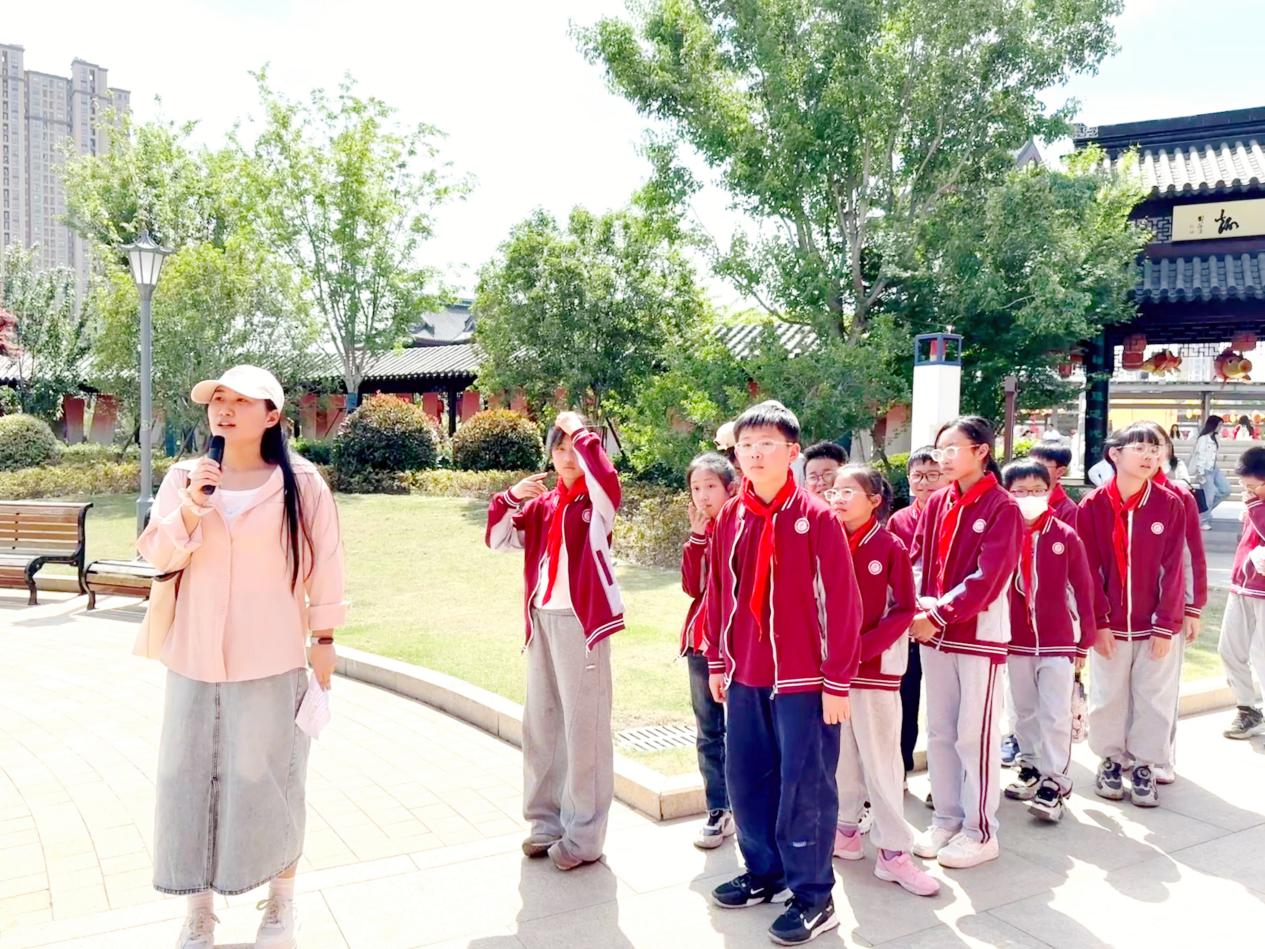 活动中,大学生党员化身“小老师”,牵着附小孩子们的手,漫步萃园五景。从菱溪草堂到归乐园,张吉等六位学生党员用生动的故事,将“天人合一”的园林智慧、“天下为公”的家国情怀娓娓道来。孩子们仰着头认真聆听,不时举起小手提问,在互动中感悟青少年的责任与担当。