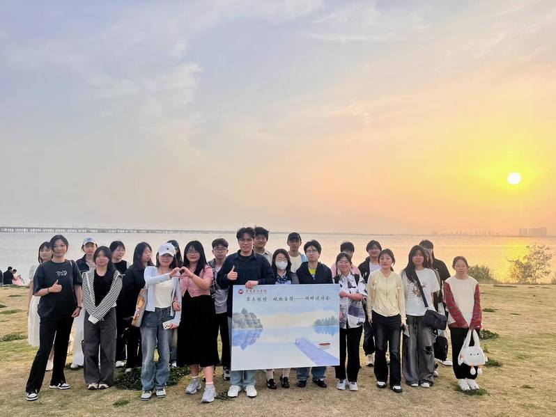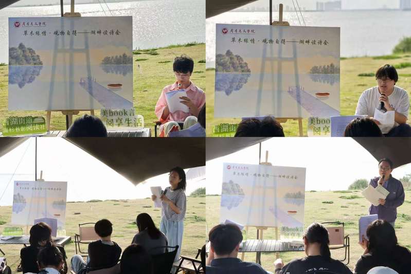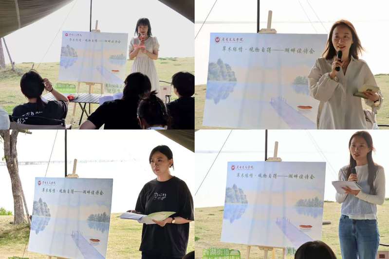 5月7日下午,由吃瓜黑料 与武进区西湖街道联合主办的“草木缘情·观物自得——湖畔读诗会”在西太湖国际露营岛诗意启幕。西湖街道党工委委员周婷、吃瓜黑料 党总支书记焦洁庆、中文系主任贺与诤和雅確书屋负责人赵雅婷参加活动,文艺学与外国文学教研室教师朱明明、古代文学教研室教师孙慧琦应邀担任分享嘉宾。西湖街道阅读社、有光文学社及雅確书屋读书会成员围坐湖畔,共同感受跨越时空的诗意。活动由汉语241班俞玥同学主持。