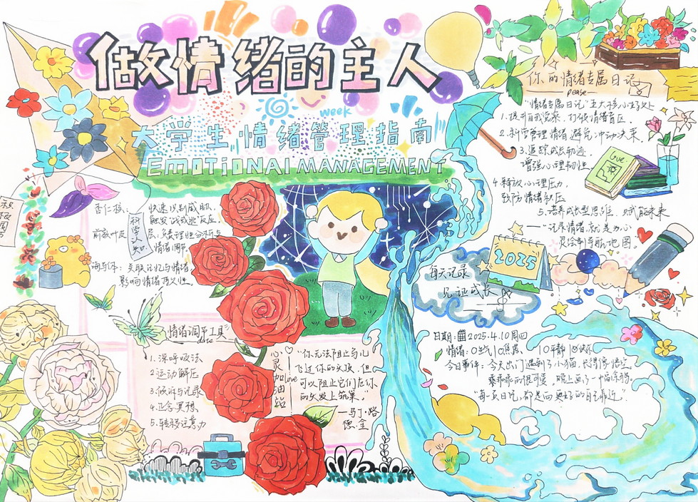 本次活动以“聆听春语,舒缓情绪”为主题。参赛同学采用绘制手抄报的方式,围绕“大学生情绪管理”、“情绪产生的机制”、“分享情绪调节技巧”等相关内容,展现自己对情绪管理的认知与思考,多维度呈现情绪管理的科学知识与实用方法,传递积极应对情绪、呵护心理健康的理念。