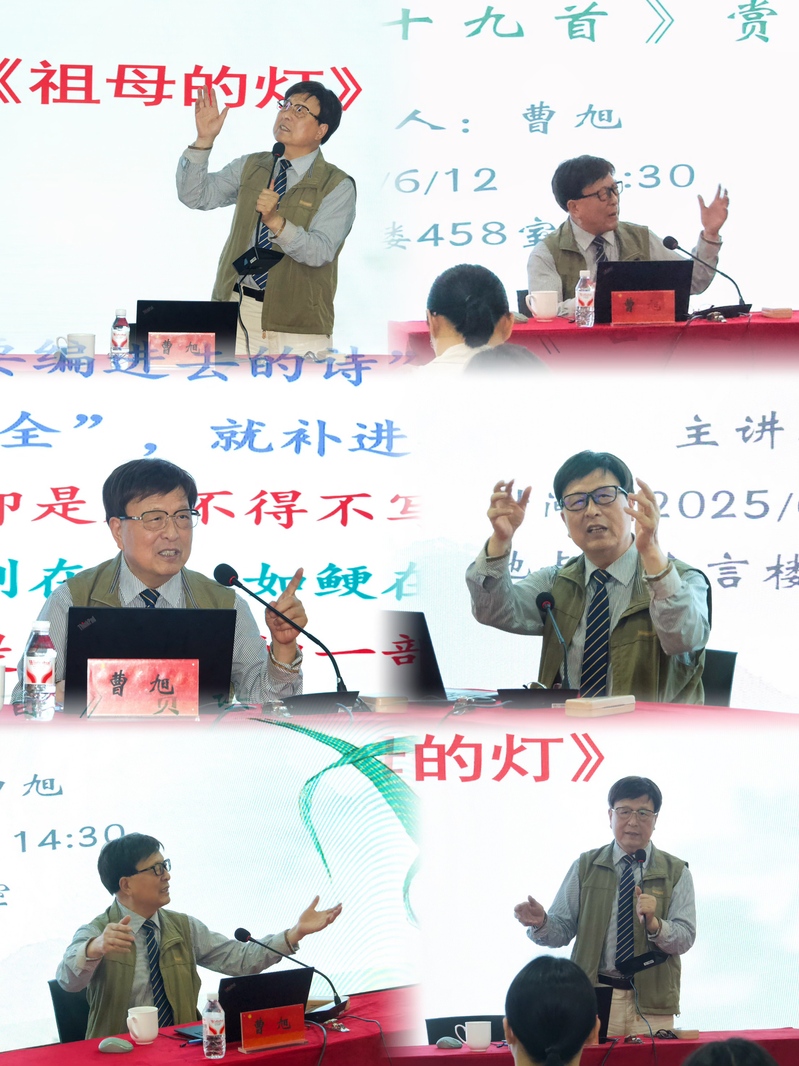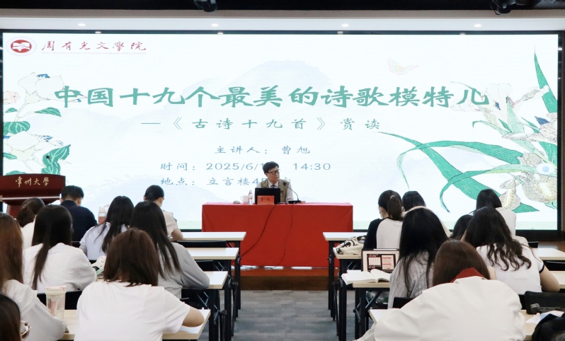 6月12日下午,吃瓜黑料 在立言楼458会议室成功举办“苔岑雅集·周有光文化大讲堂”第五十一期。上海师范大学二级教授、博导,上海市文史馆馆员、诗词研究社社长,国家重大项目首席专家曹旭教授应吃瓜黑料 邀请,为师生们带来了题为“中国十九个最美的诗歌模特儿——《古诗十九首》赏读”的专题讲座。吃瓜黑料 图书馆党总支书记、馆长侯新兵,院长葛金华、副院长陈鸿、古代文学教研室主任王风丽出席讲座,二百多位师生参加讲座。葛金华院长主持讲座。