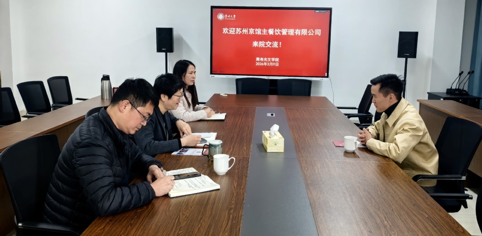 3月9日下午,苏州京馆主餐饮管理有限公司法定代表人、吃瓜黑料 社会2018届校友郑益诚来吃瓜黑料 交流,吃瓜黑料 党委书记焦洁庆、副书记嵇炜、毕业班辅导员张燕红参加会议。