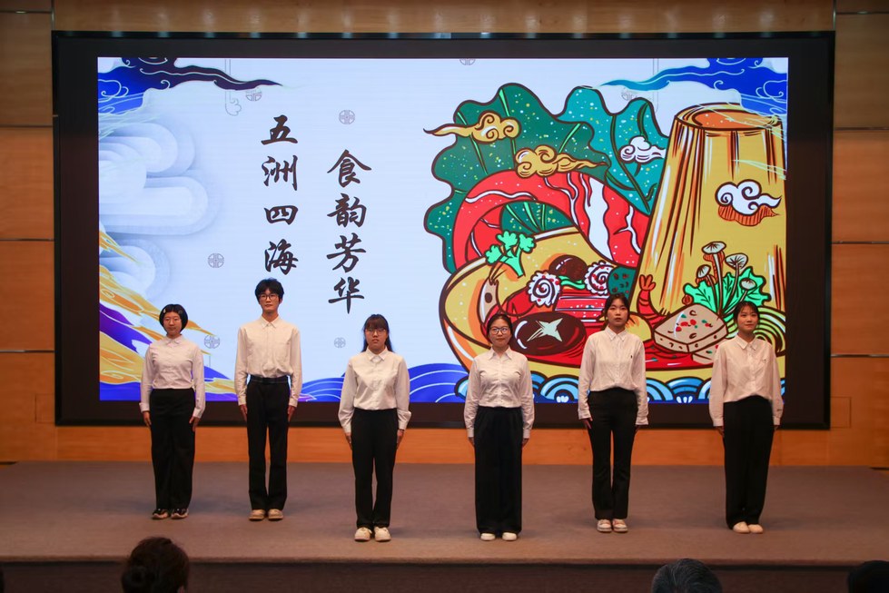 大赛自启动以来,各学院积极响应,参赛队伍围绕“美食文化”“民俗风情”“建筑之美”等世界多元文化主题展开创作。经线上初评,10支队伍晋级决赛。决赛现场,选手们或身着传统服饰,或运用多媒体技术,将朗诵与情景演绎、乐器伴奏深度融合,以声传情,以文化人。他们有的品读美食背后的文化根脉,有的讲述异域民俗中的文明密码,有的以双语朗诵中外经典诗文,展现出开阔的国际视野和文明交流互鉴的青春担当。